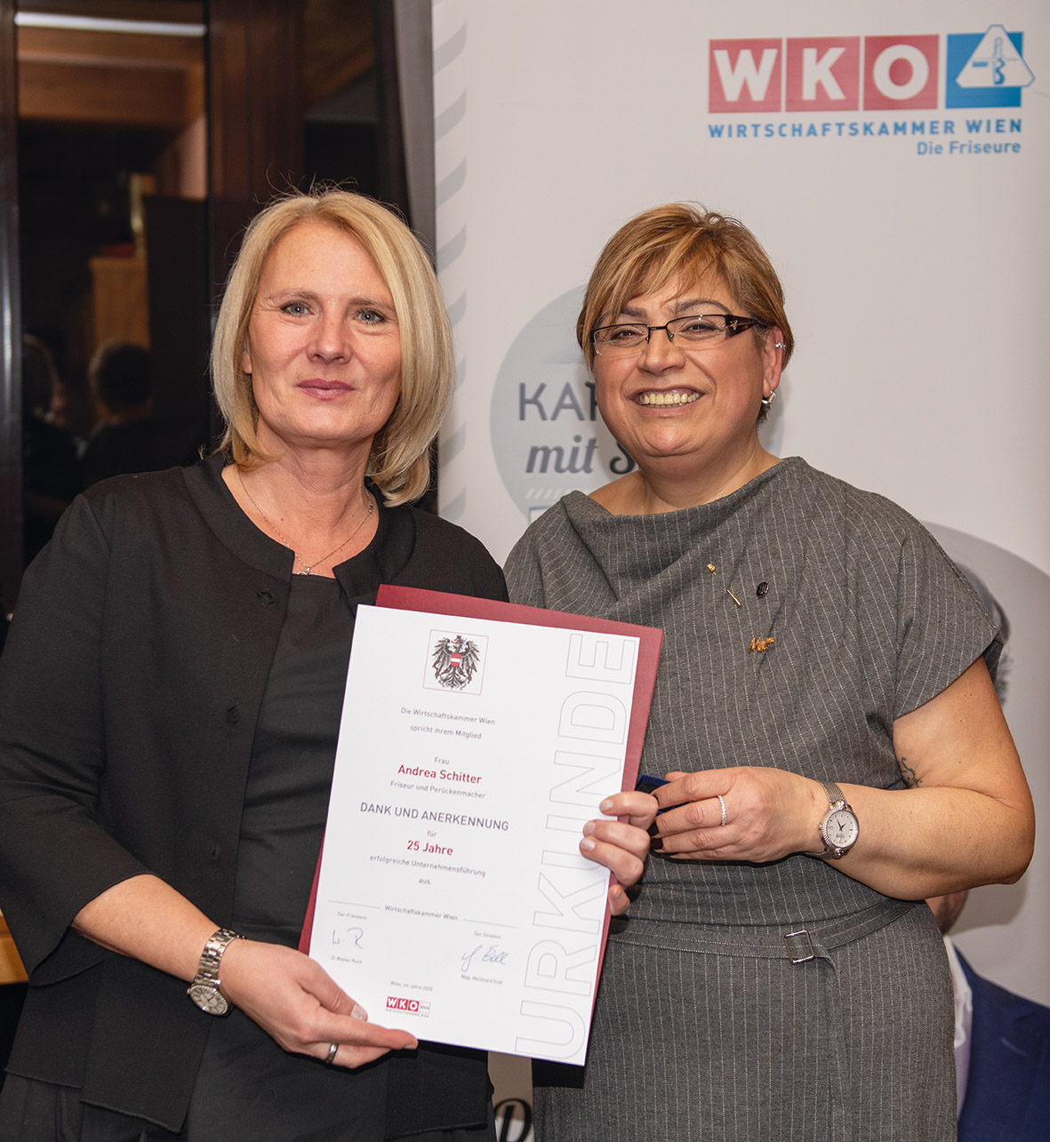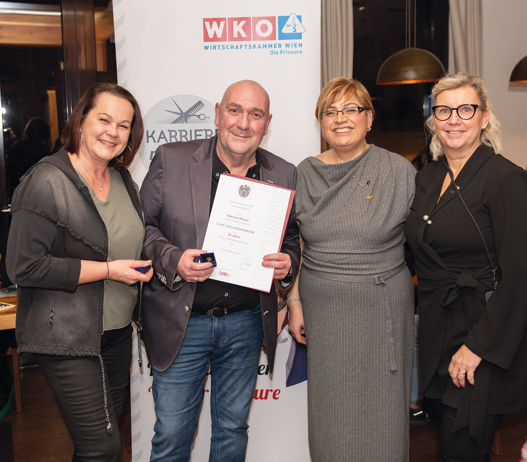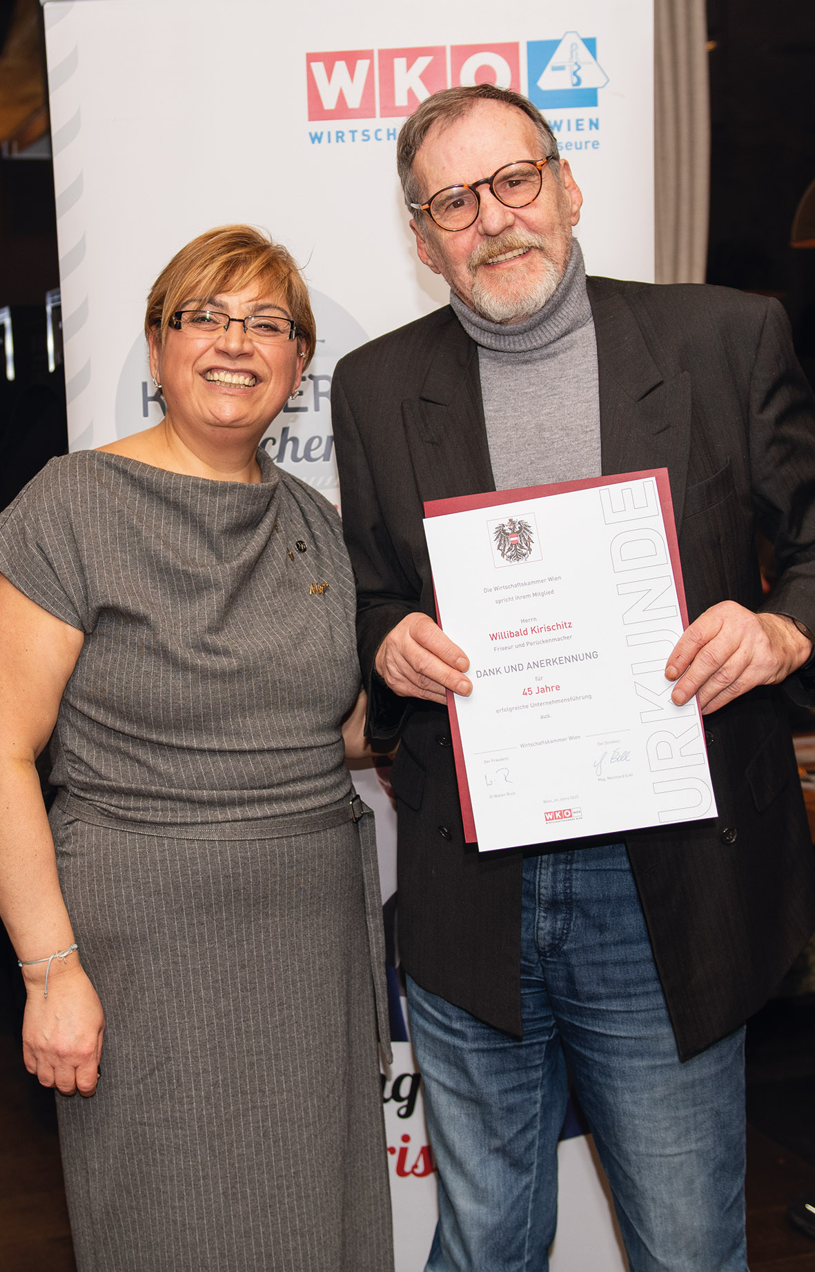Im Rahmen des heurigen Neujahrempfangs wurden viele Friseurunternehmerinnen und Friseurunternehmer, die auf eine langjährige erfolgreiche Berufserfahrung von 25 bis 45 Jahren zurückblicken konnten, geehrt. Darunter Willi Kirischitz mit 45 Jahren und Claus Staufer mit 35 Jahren.