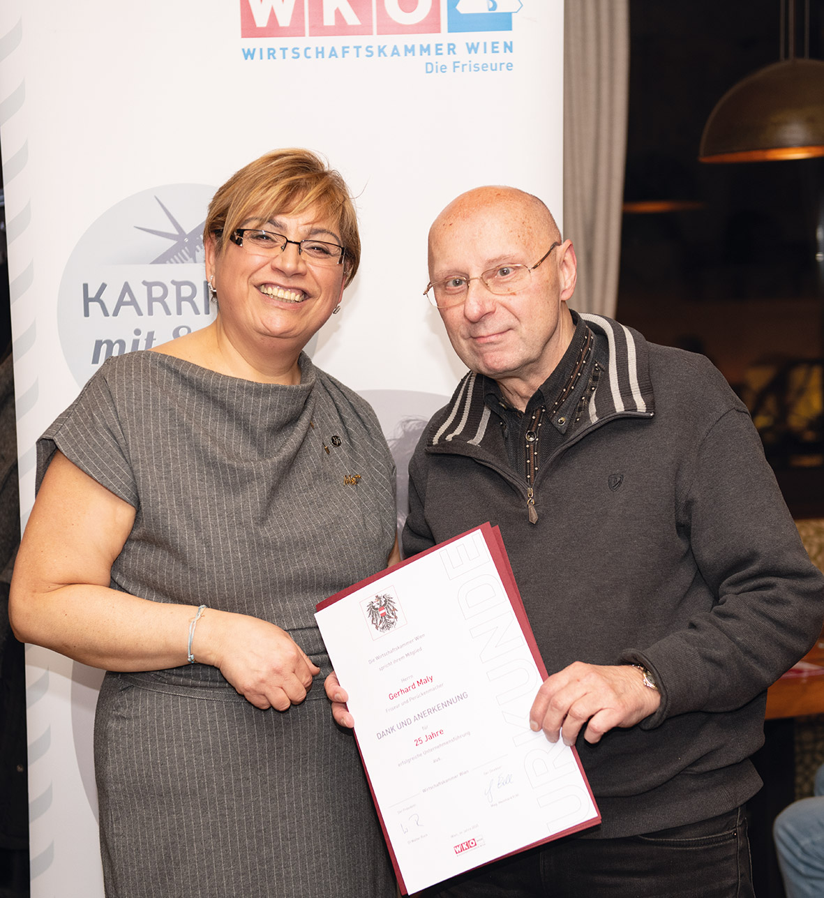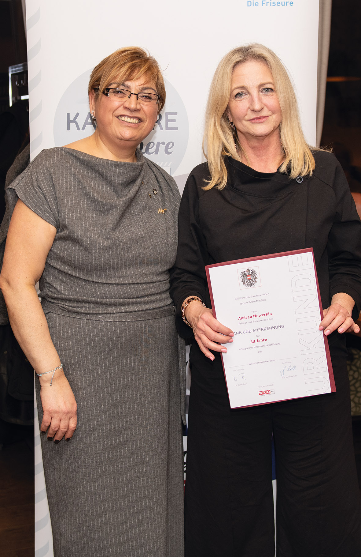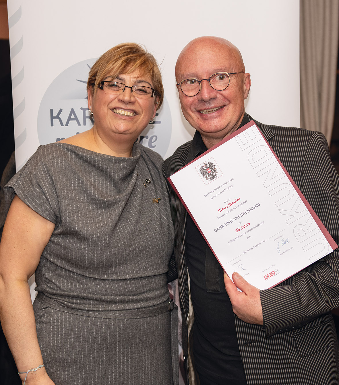 Im Rahmen des heurigen Neujahrempfangs wurden viele Friseurunternehmerinnen und Friseurunternehmer, die auf eine langjährige erfolgreiche Berufserfahrung von 25 bis 45 Jahren zurückblicken konnten, geehrt. Darunter Willi Kirischitz mit 45 Jahren und Claus Staufer mit 35 Jahren.