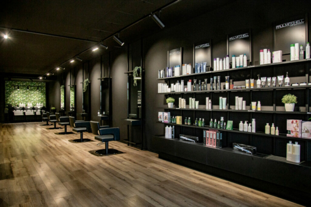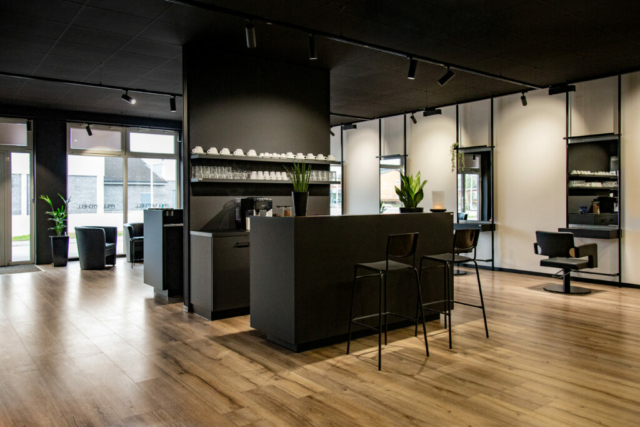 Passend zu den klassischen Paul Mitchell®-Produkten haben sich die Inhaber für ein schwarz-weißes Konzept entschieden. „Wir sehen Parallelen zwischen unserer Geschichte und den Anfängen von Paul Mitchell®. Das zeigt unser Salon jetzt auch optisch: Eine Wand ist schwarz gestrichen, die andere weiß.“ Der geräumige, 200 m2 große Salon mit 14 Bedienplätzen wirkt durch die dunklen Möbel edel und cool. Durch die elektronische Musik, die aus den Boxen schallt, erinnert die Atmosphäre fast an einen exklusiven Club. Die indirekten und direkten Lichtquellen haben unterschiedliche Helligkeitsstufen und können je nach Tageslicht angepasst werden. In der Mitte des offenen Raumes gibt es einen Barber- Bereich sowie eine Kaffeebar.